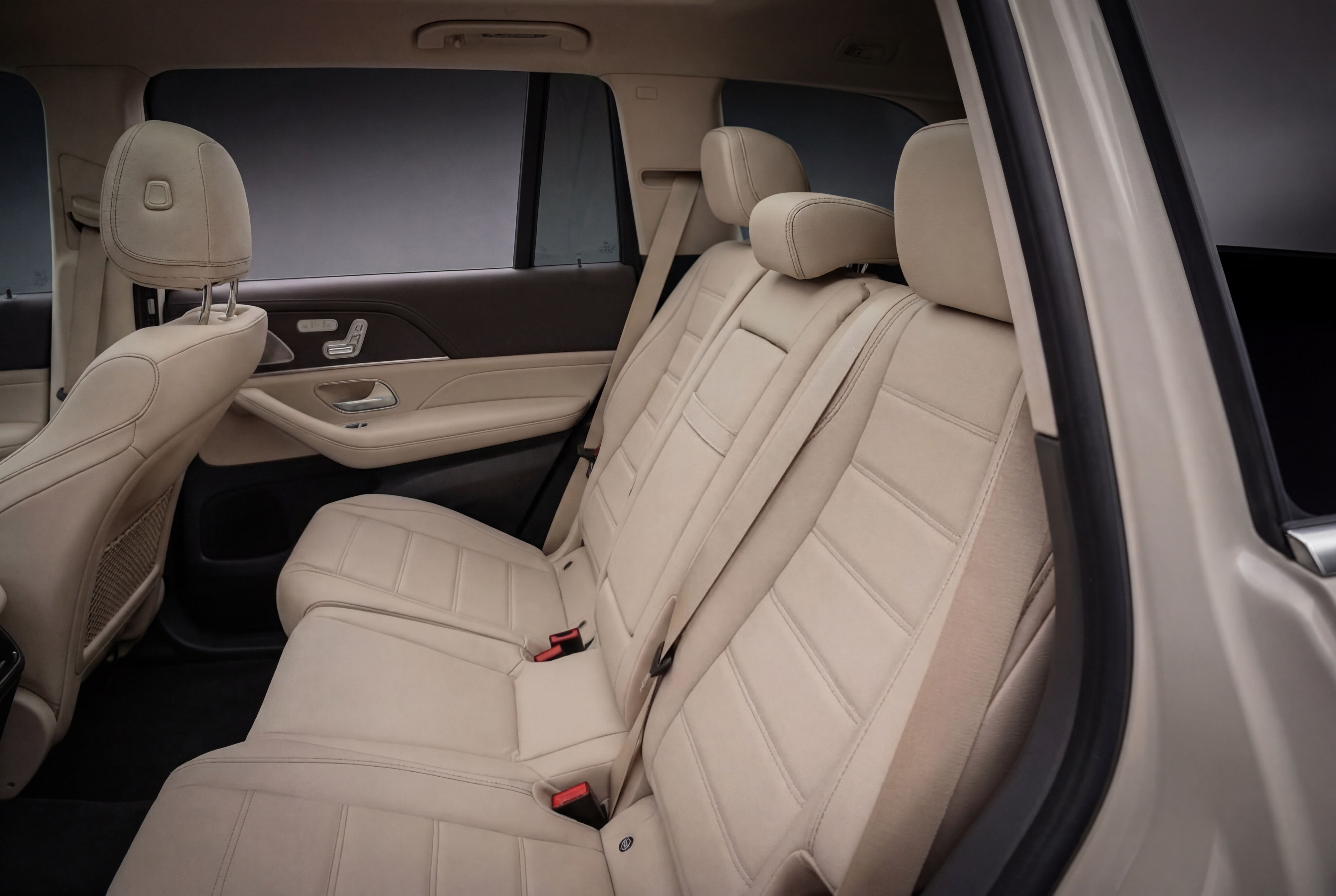 We wnętrzu Mercedes GLS 450d oferuje przestrzeń, komfort i technologie klasy premium. Kabina została zaprojektowana z myślą o wygodzie wszystkich pasażerów — zarówno z przodu, jak i na dwóch tylnych rzędach siedzeń, a w konfiguracji 7-osobowej zapewnia wyjątkową elastyczność użytkowania. Wysokiej jakości materiały wykończeniowe, w tym ekskluzywna skóra, drewno i metalowe akcenty, tworzą elegancką atmosferę. Komfortowe fotele z funkcją podgrzewania, wentylacji oraz masażu dostępne są opcjonalnie, a trzeci rząd siedzeń pozwala na przewóz większej liczby osób bez kompromisów w zakresie przestrzeni.